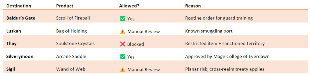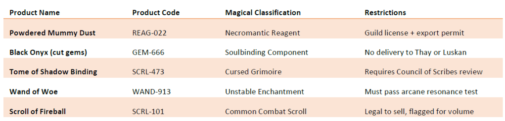 In the real world, restricted items might include pharmaceuticals or firearms. In Faerûn? It’s enchanted reagents, cursed objects, or anything that screams “necromancer starter kit.”