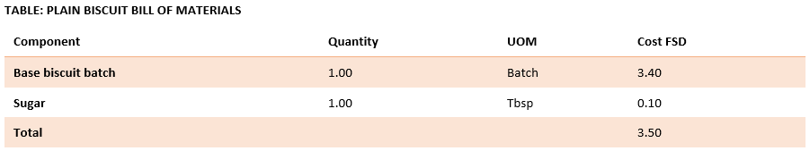 The table below lists each biscuit variant discussed, its base, and the additional or modified ingredients that create it. This is the table planners use when reviewing BOM impact and pricing changes.