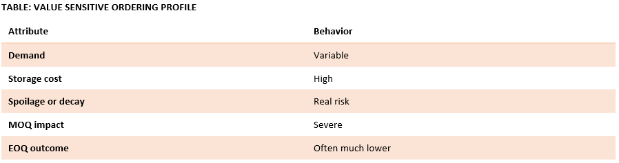 Here, EOQ is usually far lower than the supplier’s MOQ. Every unit above EOQ increases tied-up cash and write-off exposure.