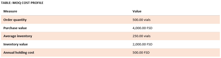 When the supplier’s MOQ dictates the order size, the impact is dramatic. The business must purchase 500 vials at once, tying up 4,000 FSD. Average inventory jumps to 250 vials, with a value of 2,000 FSD, and annual holding costs soar to 500 FSD. This approach locks up far more cash and increases the risk of unsold stock.