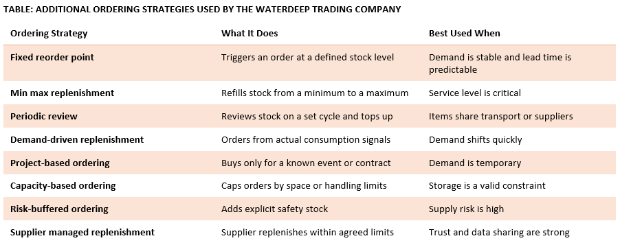 MOQ and EOQ frame the core tension between supplier constraints and internal cost control. The company also uses additional ordering strategies to fit product behavior, demand visibility, and risk tolerance. These approaches complement MOQ and EOQ rather than replace them.