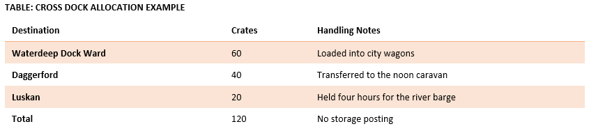For the Waterdeep Trading Company, cross-docking protects coin, reduces waste, and supports reliable trade across the Sword Coast. Used wisely, it keeps warehouses clear and customers satisfied.