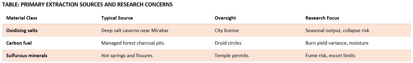 Restricted materials are regulated inputs that remain stable when sealed and separated, yet become dangerous when mishandled or combined. Cities permit the extraction and movement of materials only for licensed civic, mining, or construction purposes.