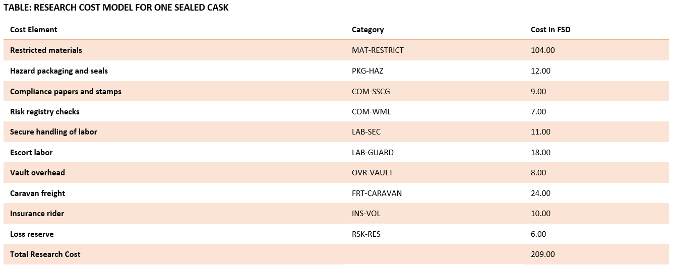 Research costing is intended to reveal hidden weight early. This table presents a conservative cost view in FSD that includes compliance and risk considerations.