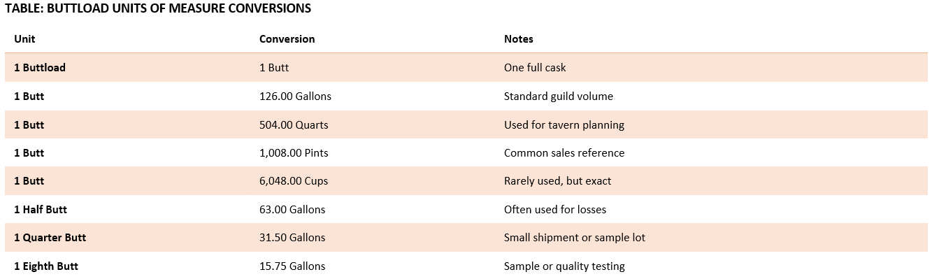 To help clerks move between ledger entries and local sales, buttloads are converted into smaller units. The table below shows common conversions used by warehouse scribes and port officials across the Sword Coast.