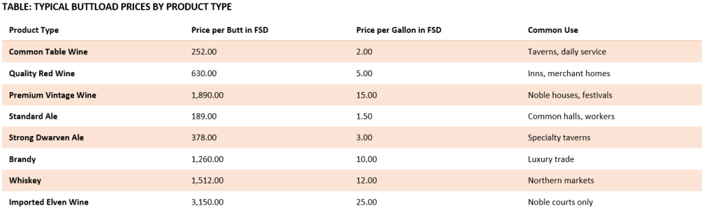 From the docks of Waterdeep to the caravan yards of Baldur’s Gate, the buttload remains a trusted standard. It simplifies contracts, enables fair trade, and allows merchants to plan purchases and sales with confidence. The Waterdeep Trading Company relies on this measure daily, and so does every tavern keeper, wine merchant, and noble steward across the Sword Coast.