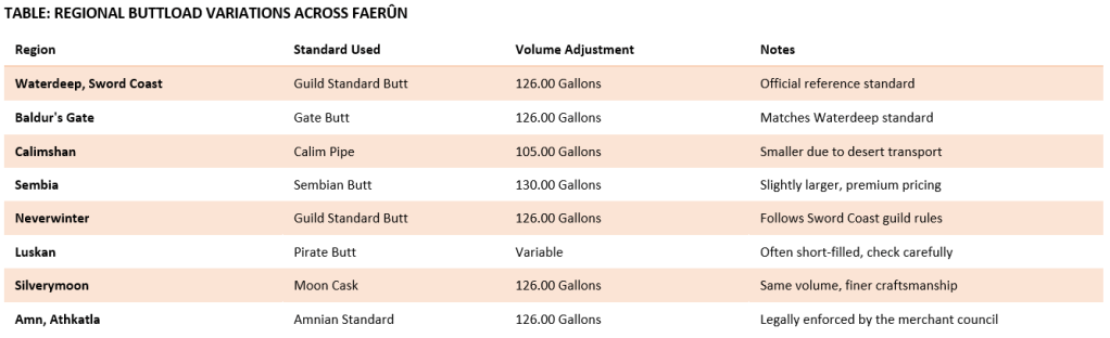 While the 126-gallon standard is widely accepted, some regions maintain their own traditional measures or apply regional adjustments. Understanding these variations helps the Waterdeep Trading Company avoid disputes and price goods correctly.