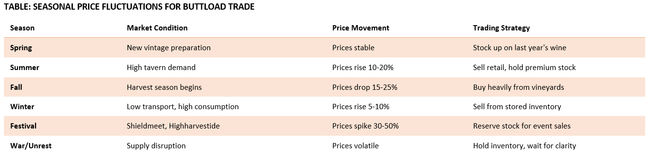 By timing purchases in the fall and holding inventory through winter and spring, the Waterdeep Trading Company captures significant margin. A buttload purchased at 500 FSD in Eleint (fall) may sell for 700 FSD in Alturiak (winter) without any change in quality.