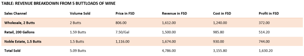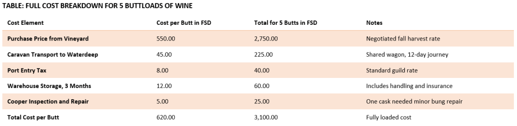 The company purchases 5 buttloads of quality red wine from a vineyard near Zazesspur in Tethyr. The shipment is transported to Waterdeep, stored for three months, and then sold to various customers.