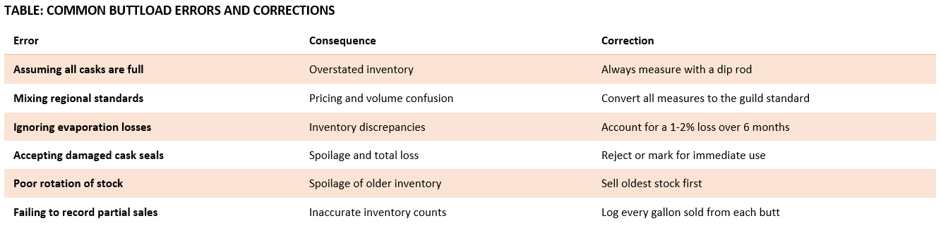 New clerks and factors often make predictable errors when working with buttloads. The Waterdeep Trading Company trains all warehouse staff to avoid these mistakes.