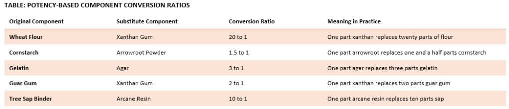 In the kitchens, bakeries, and alchemical halls of Faerûn, formulation is a controlled practice. At the Waterdeep Trading Company, recipes are treated as production records, not suggestions. When ingredients become scarce, restricted by guild charter, or shift in price, production continues only after the formulation is revised. The most delicate revisions occur when a substitute does not behave the same as the original component.