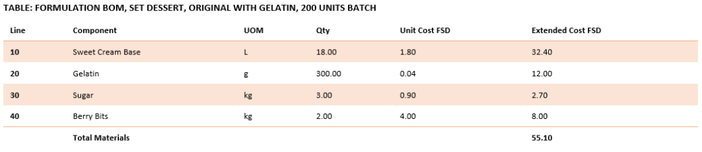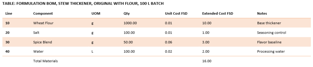The following sections provide worked examples that show how potency-based substitution affects formulation, routing, and costing across five production environments: kitchen thickening, glaze production, set desserts, bakery dough, and alchemical potions. Each example includes original and substitute bills of materials, route changes, and full cost rollups.