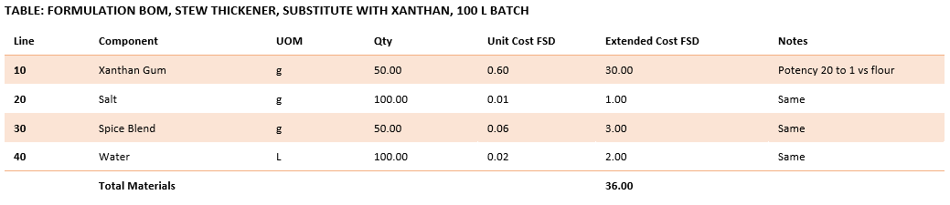 When xanthan gum replaces flour, the quantity drops sharply, but the unit cost rises. The next table shows the revised formulation after substitution.
