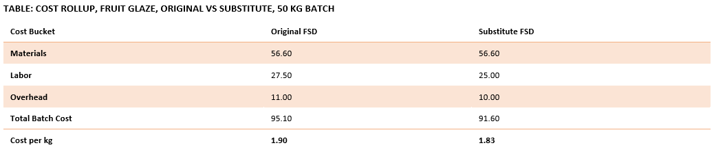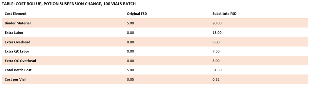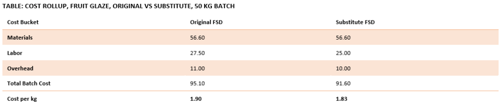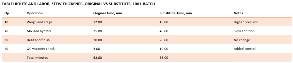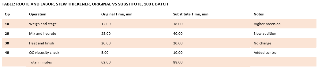 The change in material cost alone does not show the full impact. Xanthan gum requires more precise weighing, slower addition, and extra inspection. The next table explains the route changes that accompany the formulation change, demonstrating how process time increases with more potent ingredients.