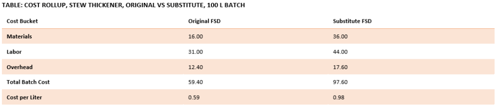The following table establishes the baseline quantities and cost before any substitution for a flour-based stew base thickener.