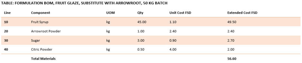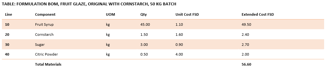 The following table shows the original glaze formulation using cornstarch as the primary thickener.