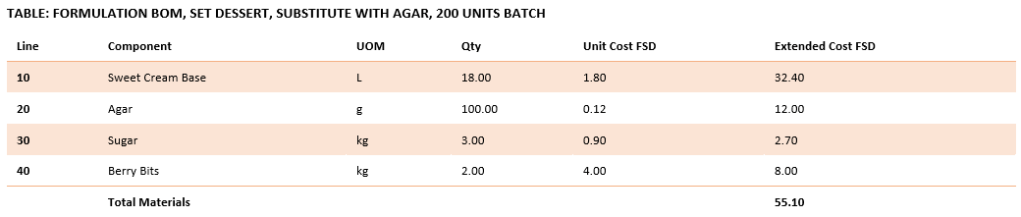 When agar is substituted, the quantity drops significantly due to its stronger gelling power, but the material cost remains the same due to higher unit pricing.
