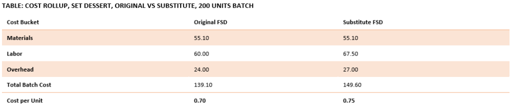 In this case, material cost stays flat, but faster activation reduces labor time. The cost rollup reflects this shift, showing net savings despite the higher unit cost of the substitute.