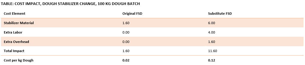 The following table compares the cost impact when switching stabilizers in a dough formulation.