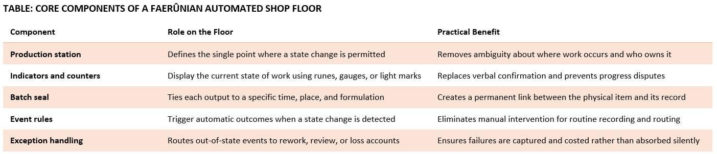 Shop floor automation in Faerûn is the practice of observing work as it happens and recording it at the exact moment of change. Runes shift, seals bind, counters advance, and ledgers update without delay. This is not about replacing workers or removing judgment. It is about defining clear stations, clear states, and clear outcomes so that work can speak for itself.