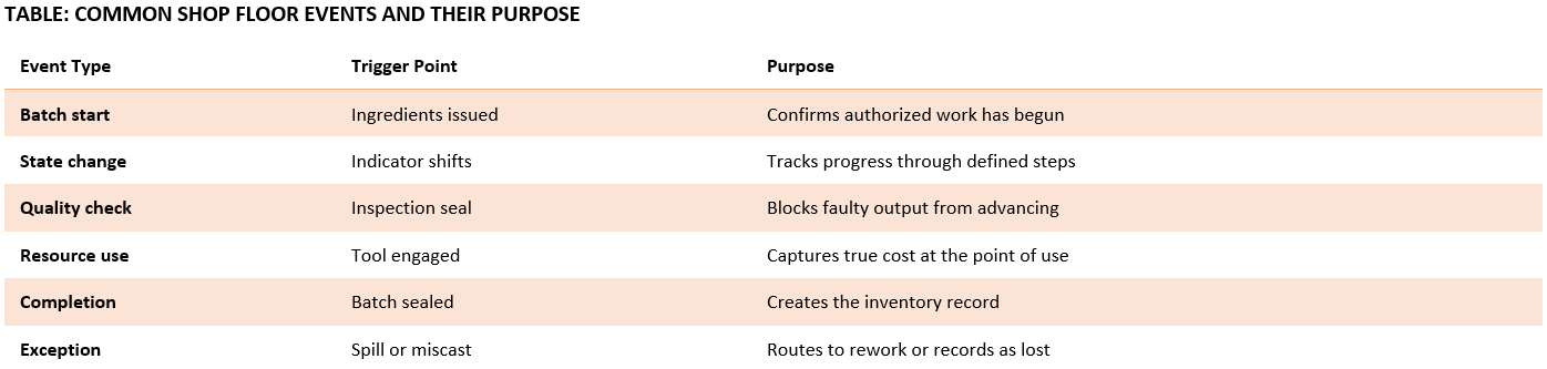 Automation depends on recognizing events rather than intentions. A batch does not exist because someone planned it; it exists because ingredients were issued. A step is not complete because time passed; it is complete because an indicator changed state.