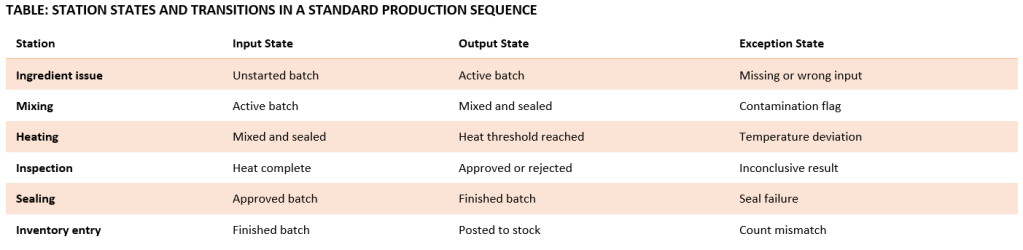 Production begins at clearly defined stations, each responsible for a single type of action such as mixing, heating, shaping, sealing, or packing. A station is not just a place; it is the point where the state is allowed to change.